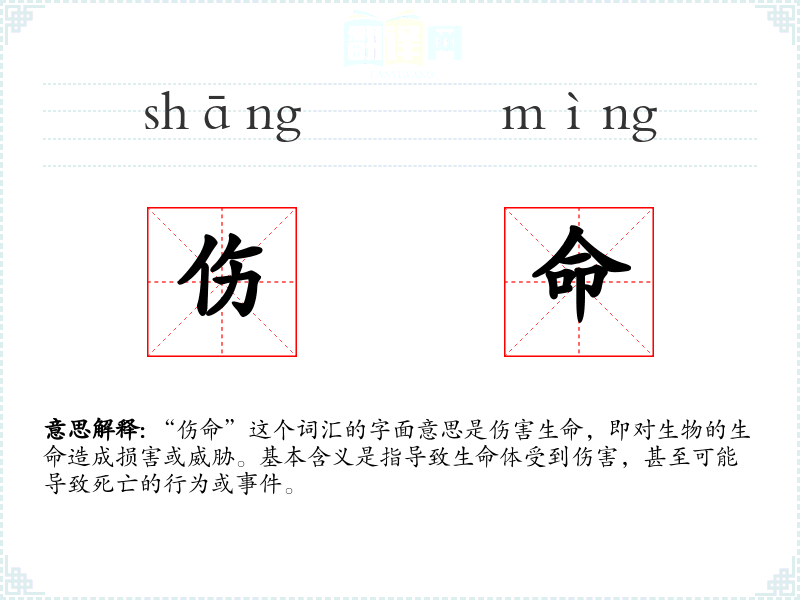 “伤命”一词由“伤”和“命”两个字组成。在古代汉语中,“伤”指伤害,“命”指生命。随着语言的发展,“伤命”逐渐成为一个固定搭配,用来描述对生命的伤害。
