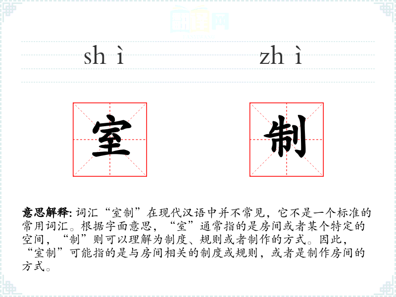 词汇“室制”在现代汉语中并不常见,它不是一个标准的常用词汇。根据字面意思,“室”通常指的是房间或者某个特定的空间,“制”则可以理解为制度、规则或者制作的方式。因此,“室制”可能指的是与房间相关的制度或规则,或者是制作房间的方式。