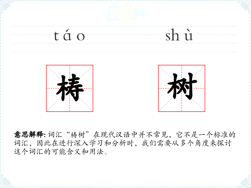 “梼”字在古代汉语中可能指某种树木或木材,但具体含义需要查阅古代文献才能确定。随着时间的推移,这个词汇可能已经不再被使用,或者其含义已经发生了变化。