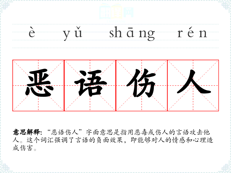 “恶语伤人”字面意思是指用恶毒或伤人的言语攻击他人。这个词汇强调了言语的负面效果,即能够对人的情感和心理造成伤害。