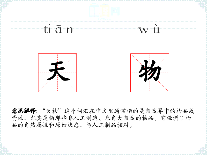 “天物”一词的词源较为直接,由“天”和“物”两个字组成。在古代汉语中,“天”常指自然界或神,而“物”指物品或事物。随着时间的推移,“天物”逐渐被用来指代那些来自自然界的物品。