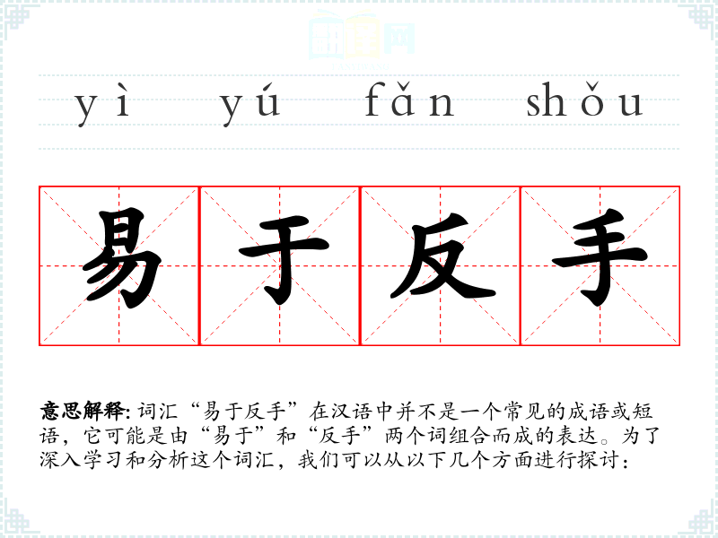 词汇“易于反手”在汉语中并不是一个常见的成语或短语,它可能是由“易于”和“反手”两个词组合而成的表达。为了深入学*和分析这个词汇,我们可以从以下几个方面进行探讨: