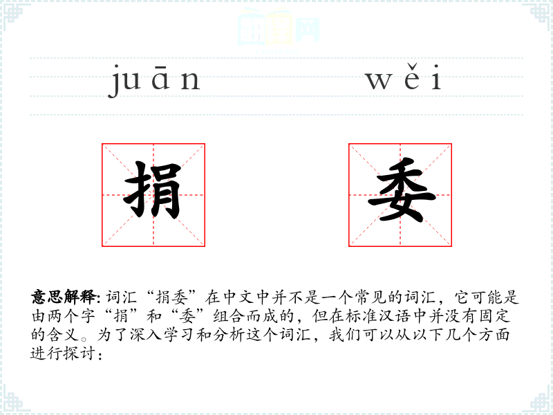 词汇“捐委”在中文中并不是一个常见的词汇,它可能是由两个字“捐”和“委”组合而成的,但在标准汉语中并没有固定的含义。为了深入学习和分析这个词汇,我们可以从以下几个方面进行探讨: