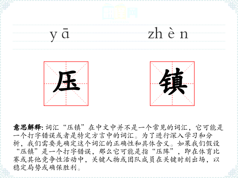 词汇“压镇”在中文中并不是一个常见的词汇,它可能是一个打字错误或者是特定方言中的词汇。为了进行深入学*和分析,我们需要先确定这个词汇的正确性和具体含义。如果我们假设“压镇”是一个打字错误,那么它可能是指“压阵”,即在体育比赛或其他竞争性活动中,关键人物或团队成员在关键时刻出场,以稳定局势或确保胜利。