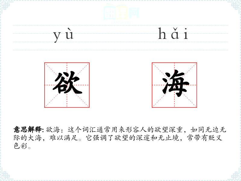 欲海:这个词汇通常用来形容人的欲望深重,如同无边无际的大海,难以满足。它强调了欲望的深邃和无止境,常带有贬义色彩。