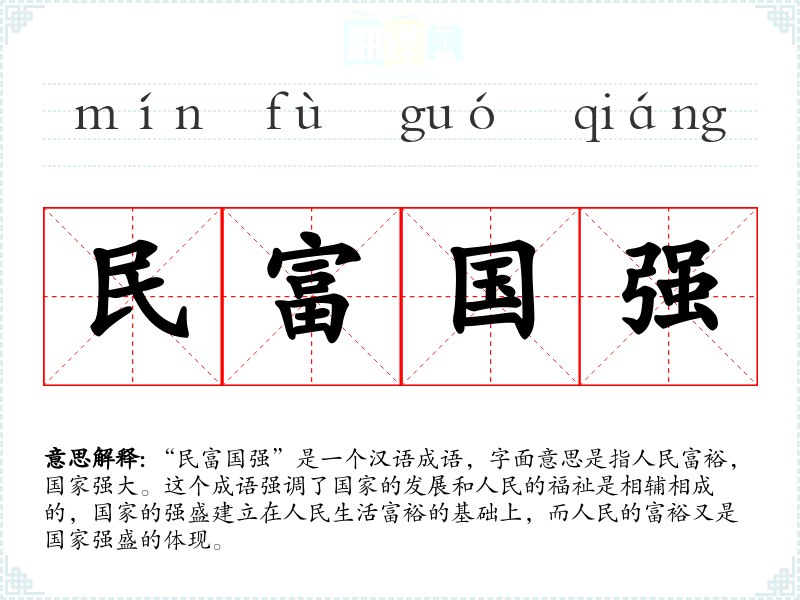 “民富国强”是一个汉语成语,字面意思是指人民富裕,国家强大。这个成语强调了国家的发展和人民的福祉是相辅相成的,国家的强盛建立在人民生活富裕的基础上,而人民的富裕又是国家强盛的体现。