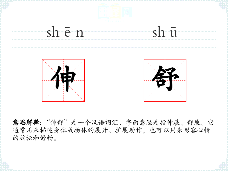 在英语中,“伸舒”可以对应为“stretch”或“unfold”,虽然这些词汇在表达上略有不同,但都传达了伸展和舒展的基本概念。