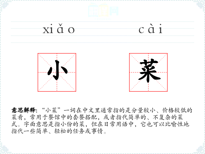 “小菜”一词在中文里通常指的是分量较小、价格较低的菜肴,常用于餐馆中的套餐搭配,或者指代简单的、不复杂的菜式。字面意思是指小份的菜,但在日常用语中,它也可以比喻性地指代一些简单、轻松的任务或事情。