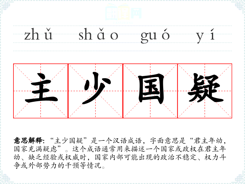 “主少国疑”是一个汉语成语,字面意思是“君主年幼,国家充满疑虑”。这个成语通常用来描述一个国家或政权在君主年幼、缺乏经验或权威时,国家内部可能出现的政治不稳定、权力斗争或外部势力的干预等情况。