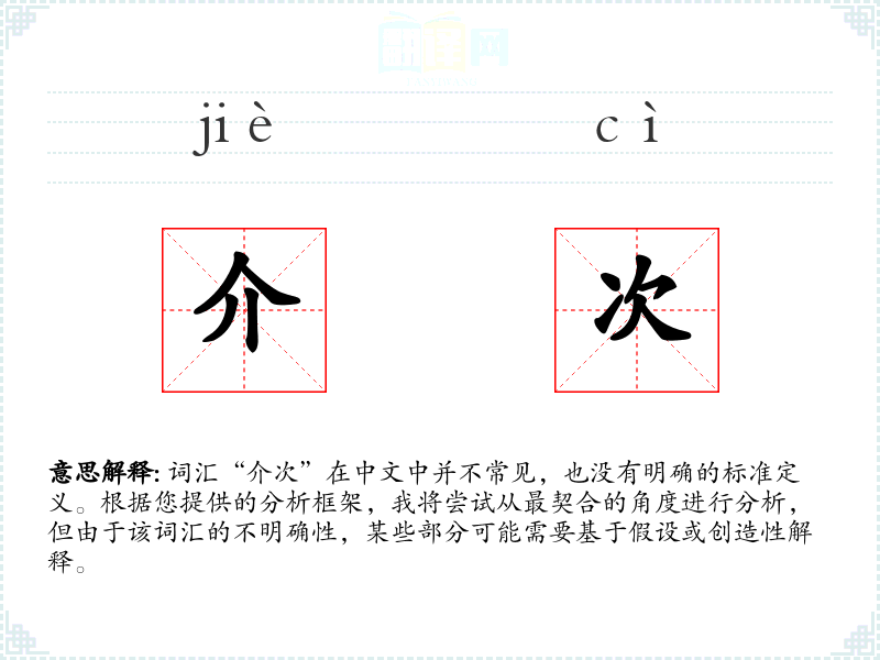 由于“介次”不是一个标准词汇,我们无法提供一个确切的字面意思和基本含义。它可能是某个方言词汇、专业术语或打字错误。