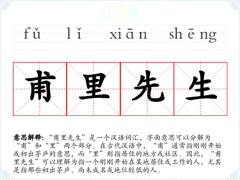 “甫里先生”是一个汉语词汇,字面意思可以分解为“甫”和“里”两个部分。在古代汉语中,“甫”通常指刚刚开始或初出茅庐的意思,而“里”则指居住的地方或社区。因此,“甫里先生”可以理解为指一个刚刚开始在某地居住或工作的人,尤其是指那些初出茅庐、尚未成名或地位较低的人。