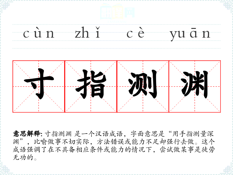 寸指测渊 是一个汉语成语,字面意思是“用手指测量深渊”,比喻做事不切实际,方法错误或能力不足却强行去做。这个成语强调了在不具备相应条件或能力的情况下,尝试做某事是徒劳无功的。