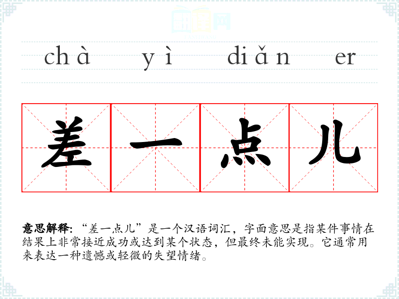 “差一点儿”是一个汉语词汇,字面意思是指某件事情在结果上非常接近成功或达到某个状态,但最终未能实现。它通常用来表达一种遗憾或轻微的失望情绪。