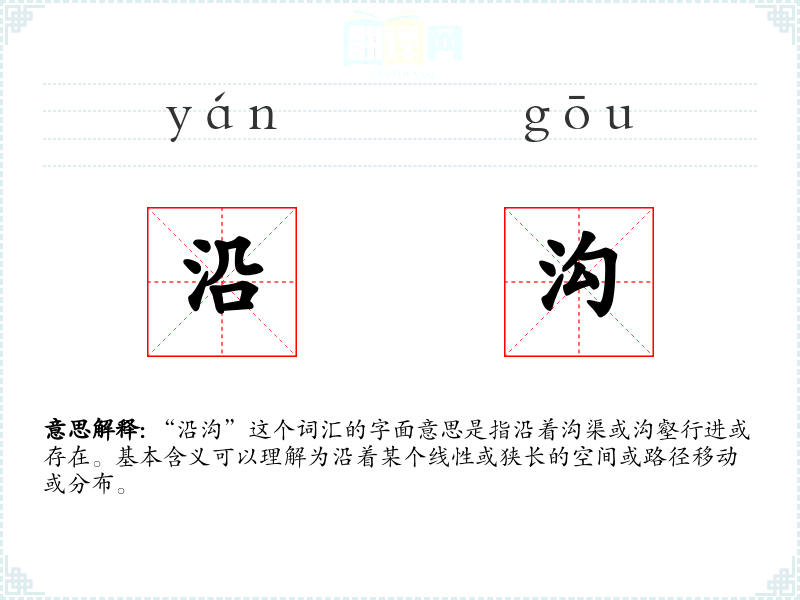 “沿”字源自古代汉语,意为顺着、沿着。“沟”字则指人工挖掘的水道或自然形成的沟壑。这两个字组合在一起,形成了描述沿着沟渠行进的词汇。