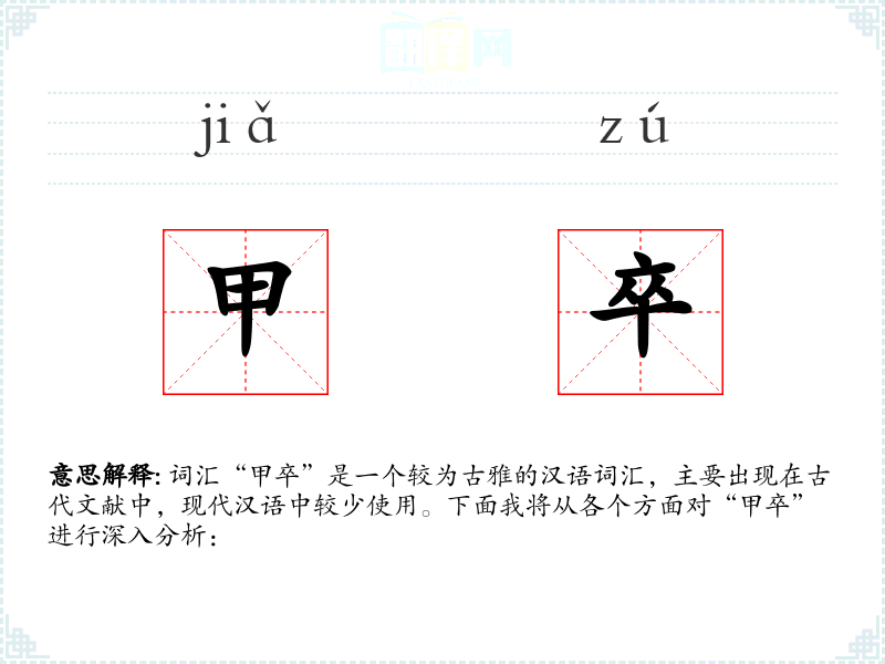 - 文学语境:在古代文学作品中,如《史记》、《汉书》等历史文献中,“甲卒”常用来描述战场上的士兵,强调其装备精良和战斗力。