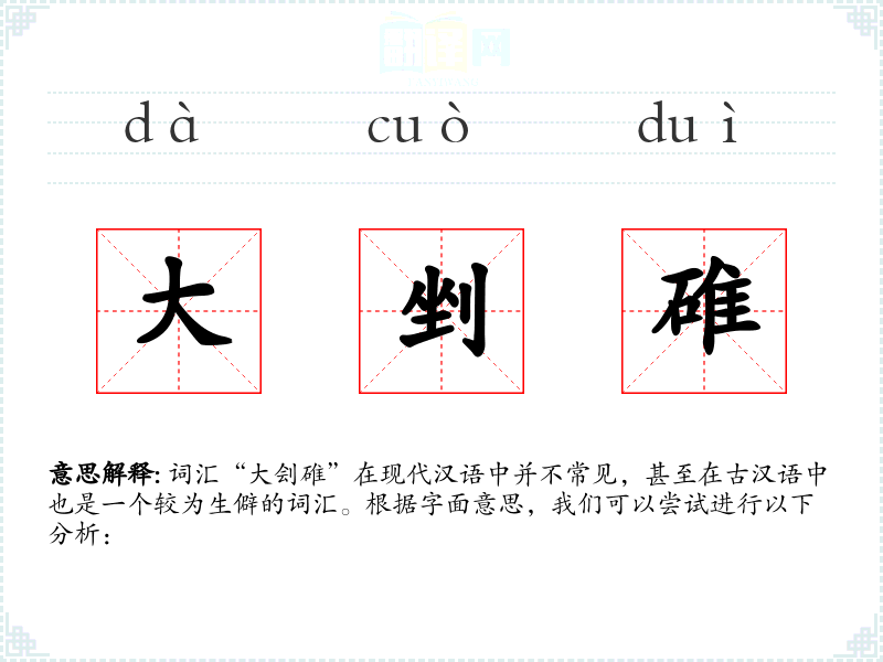 词汇“大刽碓”在现代汉语中并不常见,甚至在古汉语中也是一个较为生僻的词汇。根据字面意思,我们可以尝试进行以下分析: