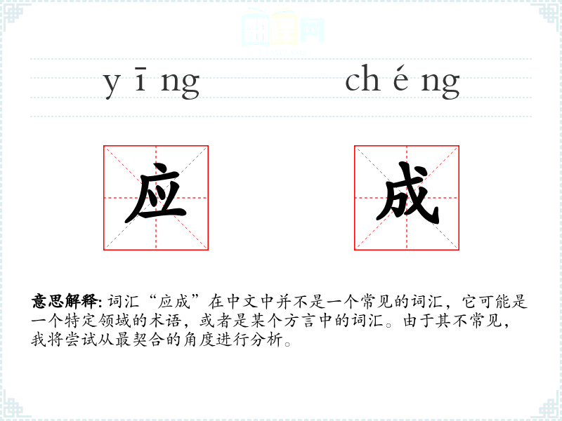 词汇“应成”在中文中并不是一个常见的词汇,它可能是一个特定领域的术语,或者是某个方言中的词汇。由于其不常见,我将尝试从最契合的角度进行分析。