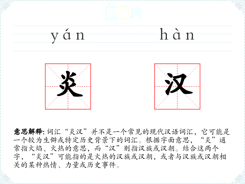 词汇“炎汉”并不是一个常见的现代汉语词汇,它可能是一个较为生僻或特定历史背景下的词汇。根据字面意思,“炎”通常指火焰、火热的意思,而“汉”则指或汉朝。结合这两个字,“炎汉”可能指的是火热的或汉朝,或者与或汉朝相关的某种热情、力量或历史。
