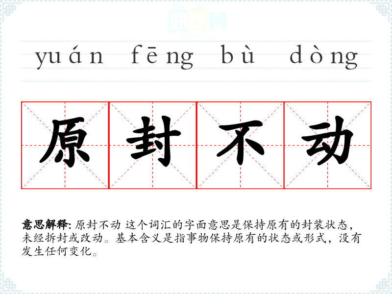 原封不动 这个词汇的字面意思是保持原有的封装状态,未经拆封或改动。基本含义是指事物保持原有的状态或形式,没有发生任何变化。