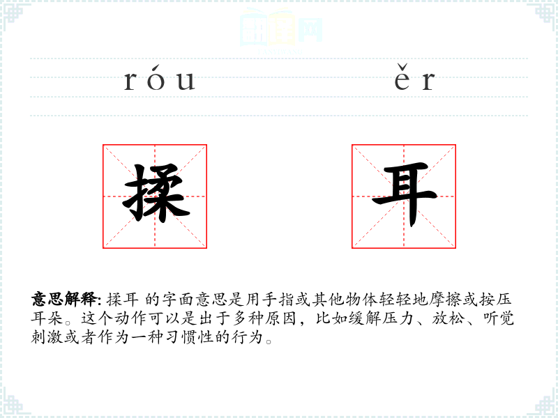 揉耳 的字面意思是用手指或其他物体轻轻地摩擦或按压耳朵。这个动作可以是出于多种原因,比如缓解压力、放松、听觉刺激或者作为一种习惯性的行为。