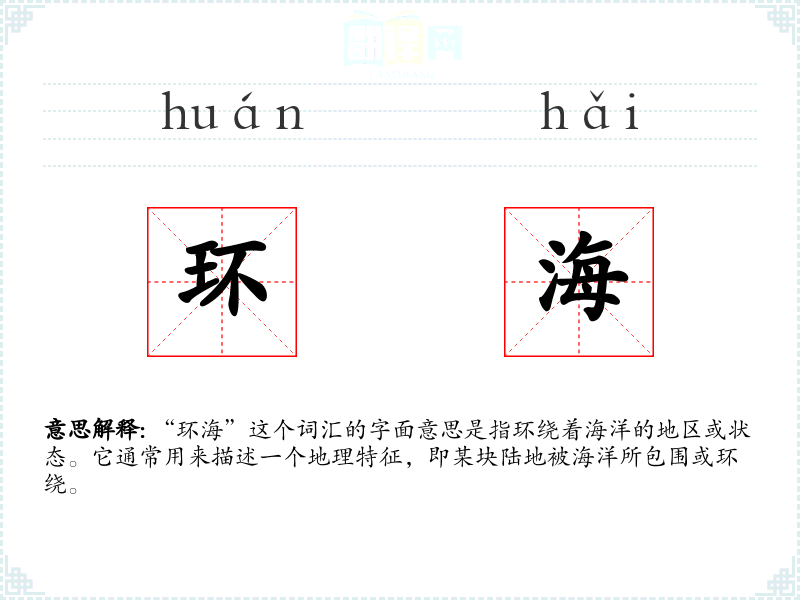 “环海”这个词汇的字面意思是指环绕着海洋的地区或状态。它通常用来描述一个地理特征,即某块陆地被海洋所包围或环绕。