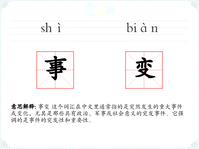 - 专业领域:在历史学、政治学等领域,“事变”特指那些具有重大历史意义的突发**。