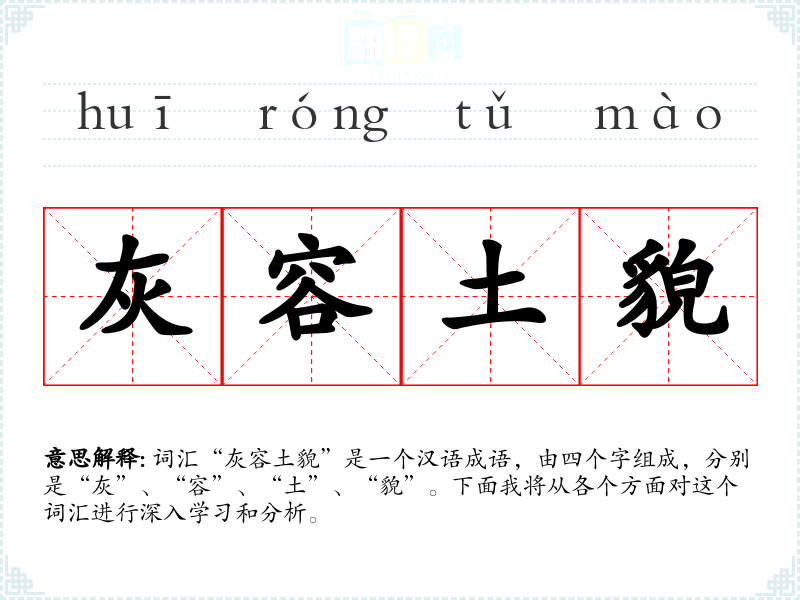 词汇“灰容土貌”是一个汉语成语,由四个字组成,分别是“灰”、“容”、“土”、“貌”。下面我将从各个方面对这个词汇进行深入学*和分析。