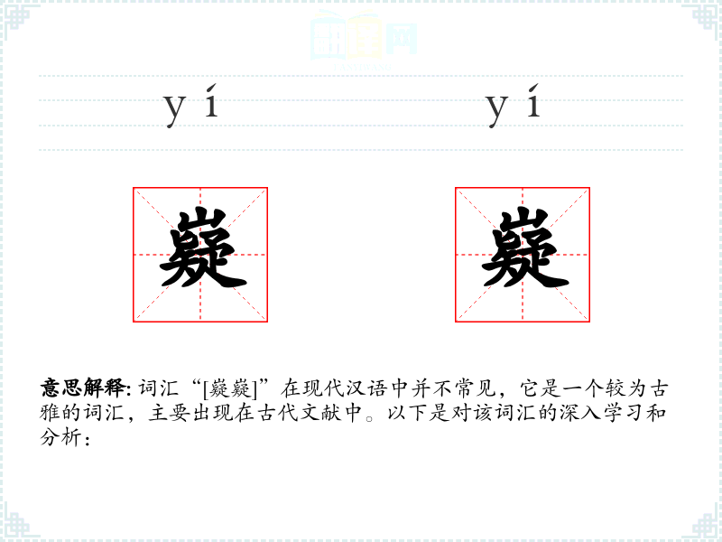 词汇“[嶷嶷]”在现代汉语中并不常见,它是一个较为古雅的词汇,主要出现在古代文献中。以下是对该词汇的深入学*和分析: