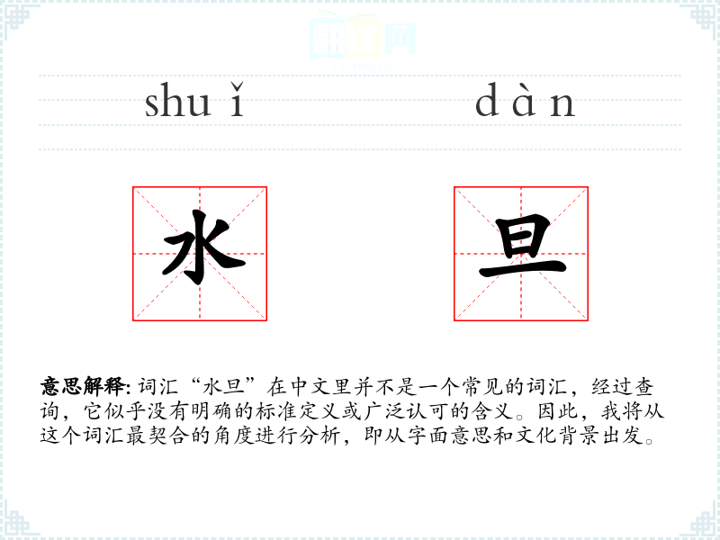 “水旦”字面意思可以理解为“水的蛋”,但这并不是一个标准的词汇或短语。在现代汉语中,这个组合并没有特定的含义。
