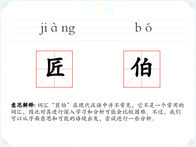 由于“匠伯”不是一个常用词汇,其词源和历史演变可能难以追溯。不过,“匠”字在古代汉语中就有使用,指的是手艺人或工匠,而“伯”字则有尊称年**的含义。