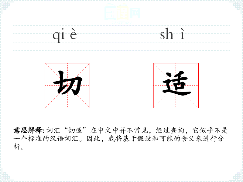 词汇“切适”在中文中并不常见,经过查询,它似乎不是一个标准的汉语词汇。因此,我将基于假设和可能的含义来进行分析。