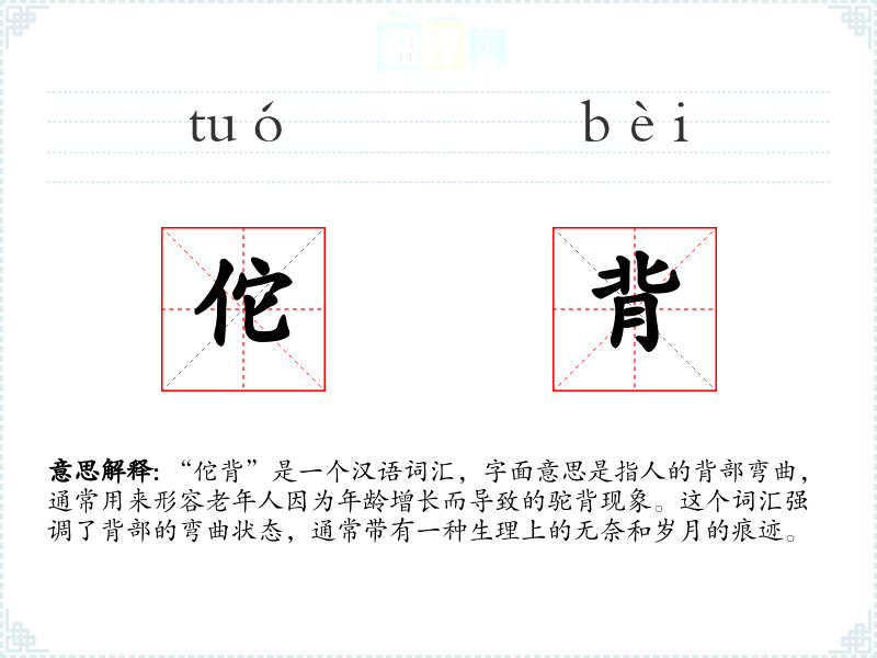 “佗背”是一个汉语词汇,字面意思是指人的背部弯曲,通常用来形容老年人因为年龄增长而导致的驼背现象。这个词汇强调了背部的弯曲状态,通常带有一种生理上的无奈和岁月的痕迹。