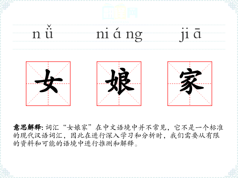 词汇“女娘家”在中文语境中并不常见,它不是一个标准的现代汉语词汇,因此在进行深入学*和分析时,我们需要从有限的资料和可能的语境中进行推测和解释。