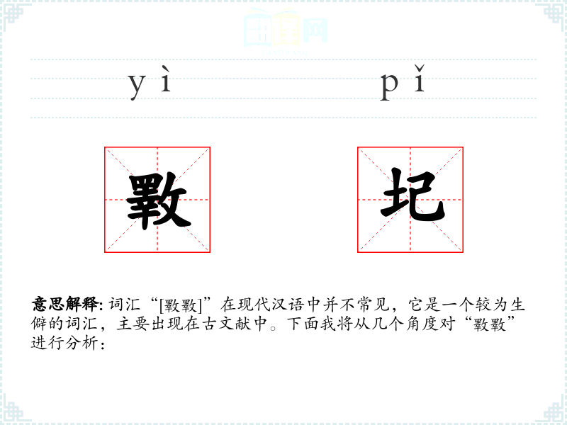 词汇“[斁斁]”在现代汉语中并不常见,它是一个较为生僻的词汇,主要出现在古文献中。下面我将从几个角度对“斁斁”进行分析: