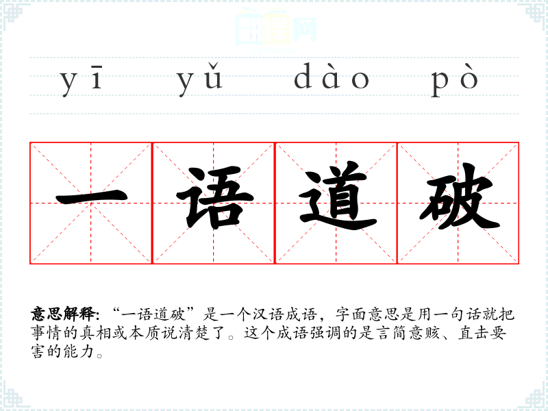 “一语道破”是一个汉语成语,字面意思是用一句话就把事情的真相或本质说清楚了。这个成语强调的是言简意赅、直击要害的能力。