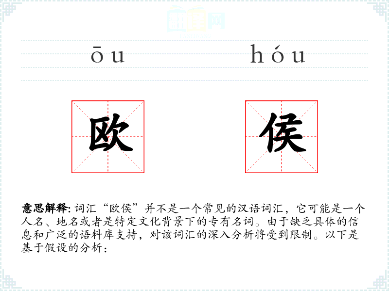- 字面意思和基本含义:由于“欧侯”不是一个标准词汇,它的字面意思和基本含义不明确。如果它是一个人名,那么它可能代表某个具体的人;如果是一个地名,则可能指代某个地方。