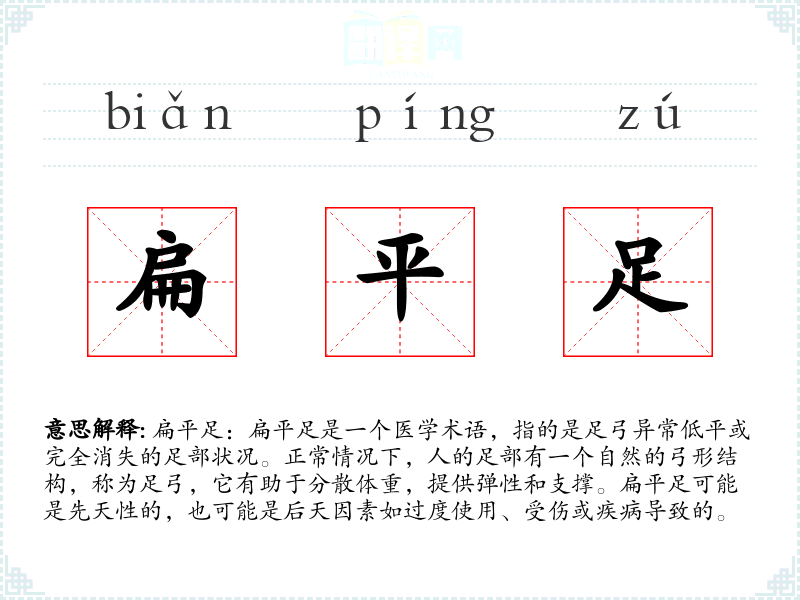 “扁平足”一词源自中文,直接描述了足部的形态。在医学术语中,它对应于英文的“flatfoot”或“pes planus”。随着医学知识的传播,这一术语在全球范围内被广泛接受和使用。