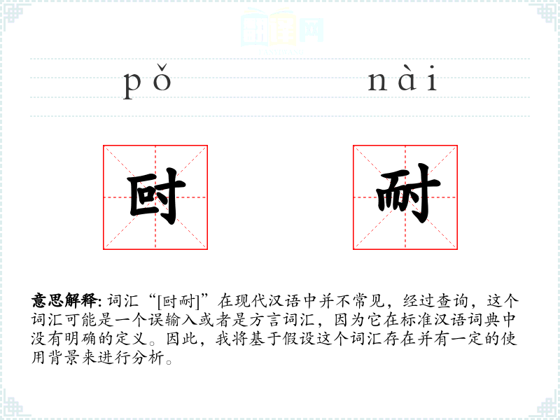 由于“[尀耐]”不是一个标准汉语词汇,我们无法给出确切的基本定义。如果这是一个方言词汇,它可能具有特定的地域性含义,需要结合具体的方言背景来解释。