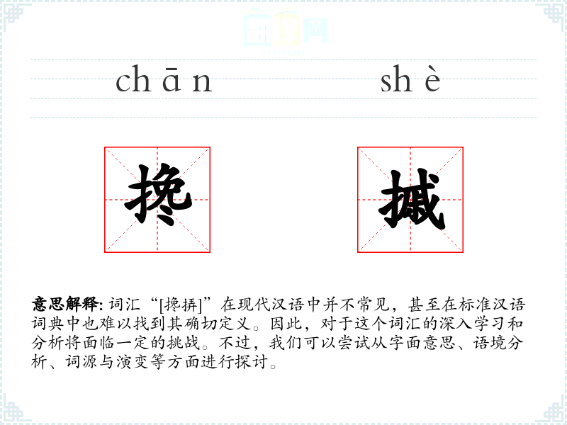 词汇“[搀挵]”在现代汉语中并不常见,甚至在标准汉语词典中也难以找到其确切定义。因此,对于这个词汇的深入学习和分析将面临一定的挑战。不过,我们可以尝试从字面意思、语境分析、词源与演变等方面进行探讨。