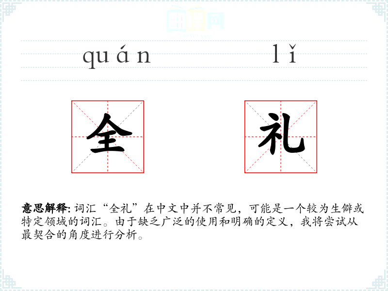词汇“全礼”在中文中并不常见,可能是一个较为生僻或特定领域的词汇。由于缺乏广泛的使用和明确的定义,我将尝试从最契合的角度进行分析。