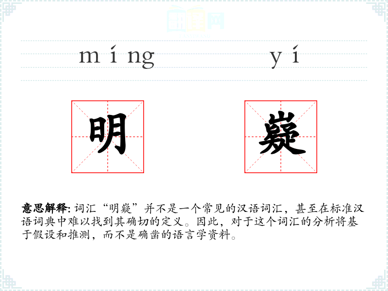 由于“明嶷”不是一个标准词汇,我们无法给出确切的字面意思和基本含义。但从字面上看,“明”通常与光明、清晰、明白等概念相关,而“嶷”则较为生僻,可能与山峰、高耸等意象有关。