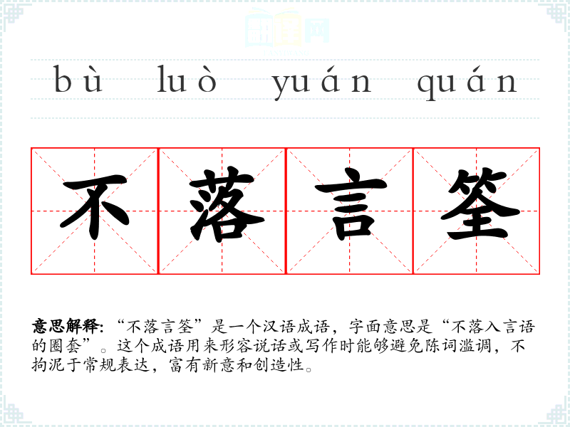 “不落言筌”是一个汉语成语,字面意思是“不落入言语的圈套”。这个成语用来形容说话或写作时能够避免陈词滥调,不拘泥于常规表达,富有新意和创造性。