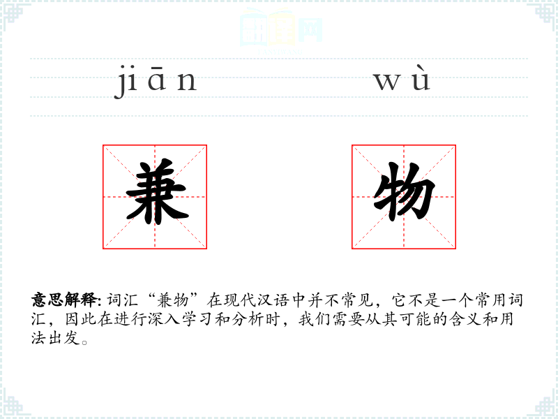 词汇“兼物”在现代汉语中并不常见,它不是一个常用词汇,因此在进行深入学习和分析时,我们需要从其可能的含义和用法出发。
