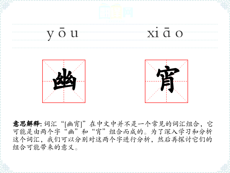 词汇“[幽宵]”在中文中并不是一个常见的词汇组合,它可能是由两个字“幽”和“宵”组合而成的。为了深入学*和分析这个词汇,我们可以分别对这两个字进行分析,然后再探讨它们的组合可能带来的意义。