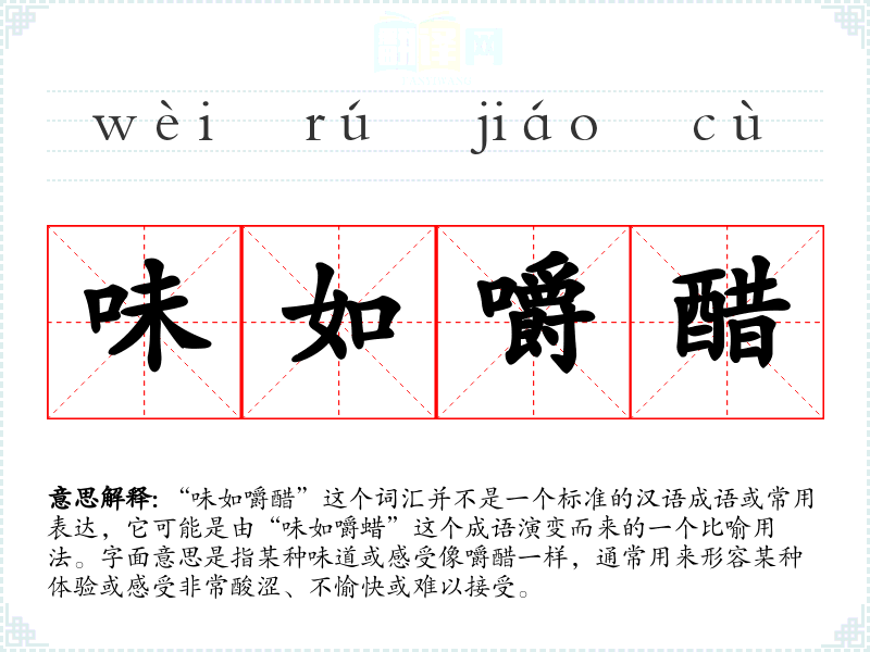 “味如嚼醋”这个词汇并不是一个标准的汉语成语或常用表达,它可能是由“味如嚼蜡”这个成语演变而来的一个比喻用法。字面意思是指某种味道或感受像嚼醋一样,通常用来形容某种体验或感受非常酸涩、不愉快或难以接受。