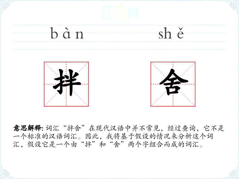 词汇“拌舍”在现代汉语中并不常见,经过查询,它不是一个标准的汉语词汇。因此,我将基于假设的情况来分析这个词汇,假设它是一个由“拌”和“舍”两个字组合而成的词汇。