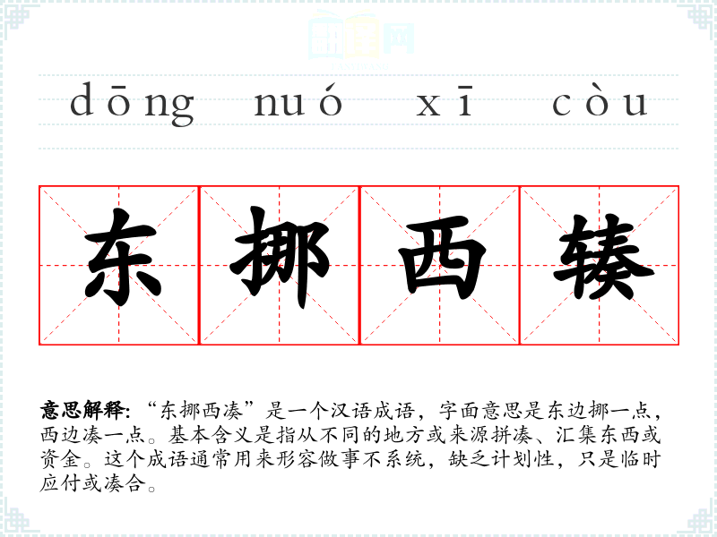 “东挪西凑”是一个汉语成语,字面意思是东边挪一点,西边凑一点。基本含义是指从不同的地方或来源拼凑、汇集东西或资金。这个成语通常用来形容做事不系统,缺乏计划性,只是临时应付或凑合。