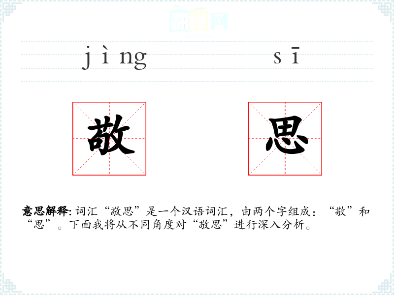 词汇“敬思”是一个汉语词汇,由两个字组成:“敬”和“思”。下面我将从不同角度对“敬思”进行深入分析。