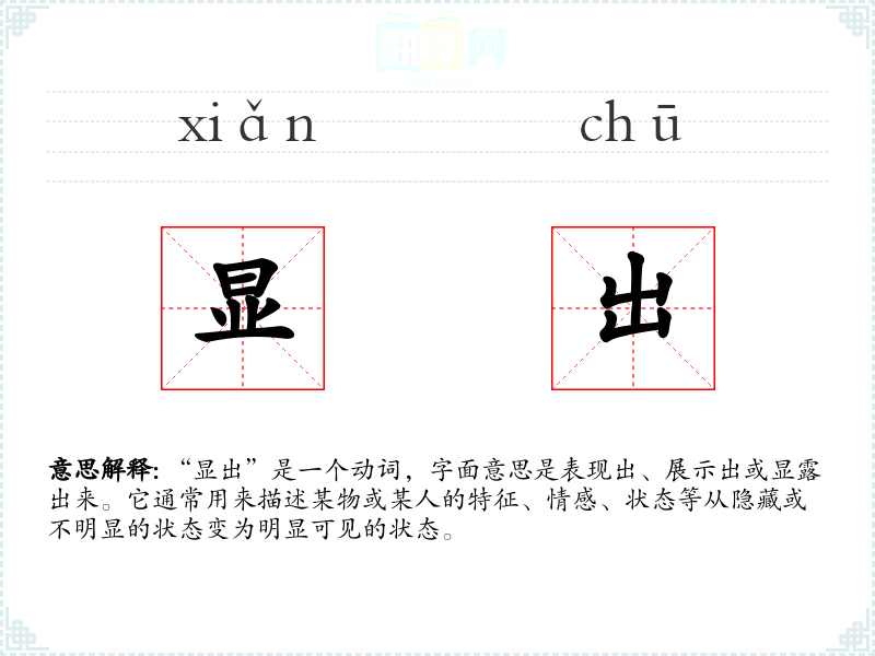 “显出”由“显”和“出”两个字组成。“显”字古汉语中意为明显、显露,“出”字意为出现、出来。两个字组合起来,强调了从隐匿到显露的过程。