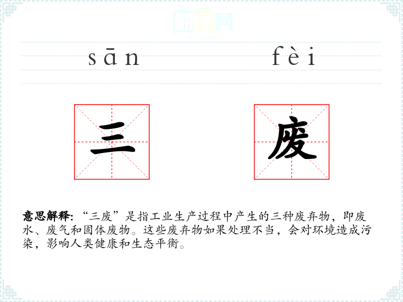 “三废”是指工业生产过程中产生的三种废弃物,即废水、废气和固体废物。这些废弃物如果处理不当,会对环境造成污染,影响人类健康和生态平衡。